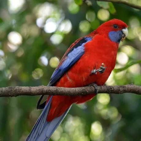 Colouring: Bright red body and belly with dark blue sections on cheeks, wings and tail.