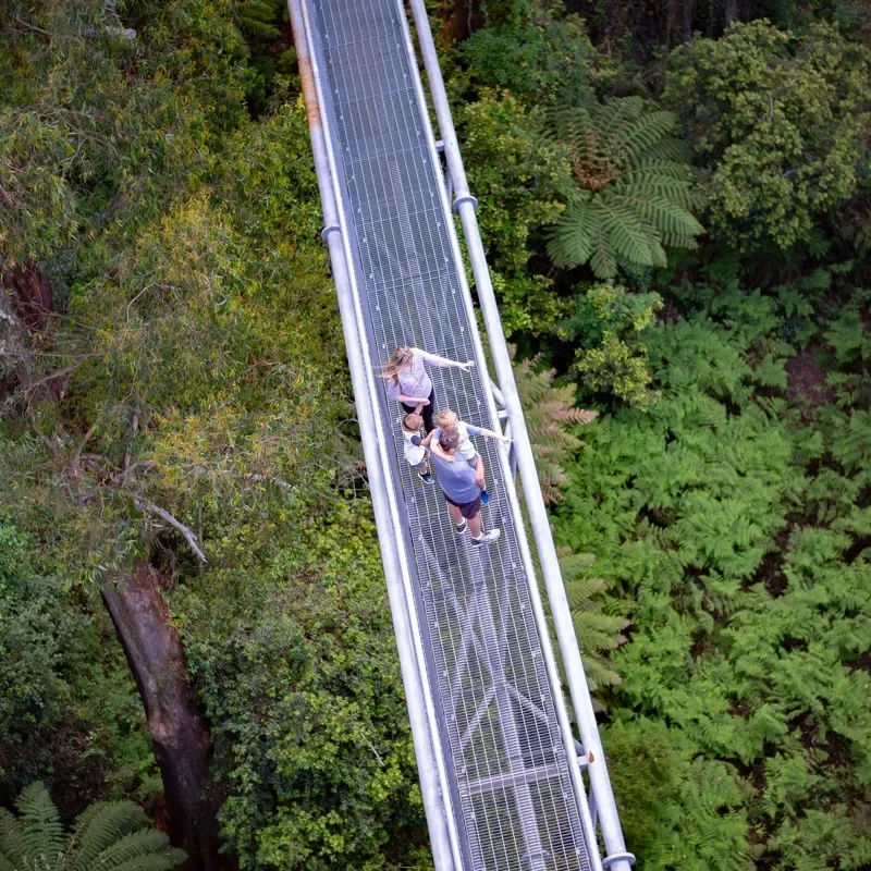 This ensured that all construction for the treetop walk could be undertaken without the clearing of native vegetation. Many of our visitors are surprised when they hear that the Fly was built by cranes using the existing tracks. Guests continually comment in regard to the minimal impact the treetop walk has had on the forest. Support facilities for the attractions are located nearby the visitor centre including water supply, sewage holding tanks, maintenance sheds, access tracks and car parking have all been located so as to ensure that no native vegetation clearing was required and so that buildings were not focal points for our visitors.